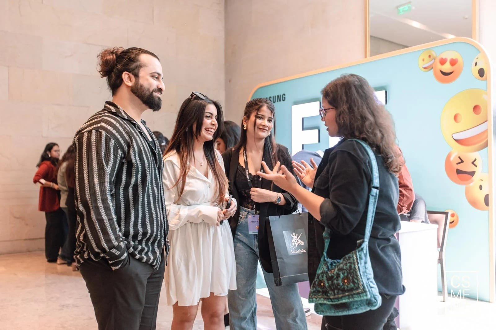 • Pay attention to branding elements such as signage, stage setups, and screens.